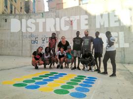 Joves dels centres oberts del Centre Històric pinten jocs tradicionals en una plaça del barri