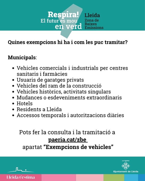 La consulta i la tramitació de les exempcions, així com si el vehicle no té distintiu ambiental i no es té domiciliat el vehicle a Lleida, es pot fer a través de paeria.cat/zbe apartat “Exempcions de vehicles”.