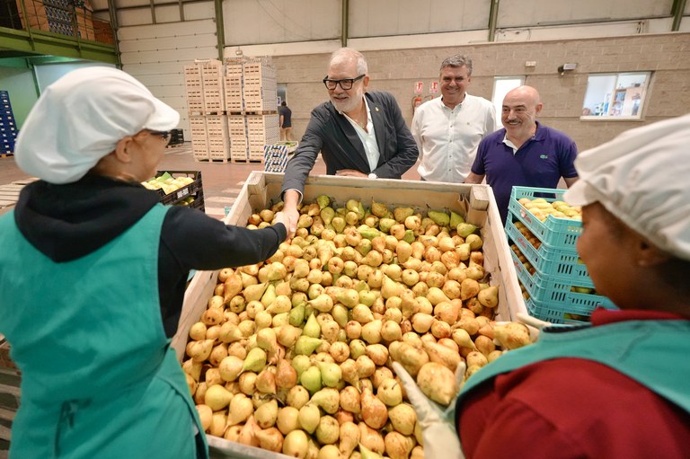 L’alcalde de Lleida, Fèlix Larrosa, ha visitat aquest dimecres les instal·lacions de la central fructícola Sanui Fruits, a l’Horta de Lleida, per conèixer de primera mà el desenvolupament de la campanya de collita, ara centrada en la pera Conference, la de major presència actualment als camps lleidatans i que forma part de la denominació d’origen Pera de Lleida.