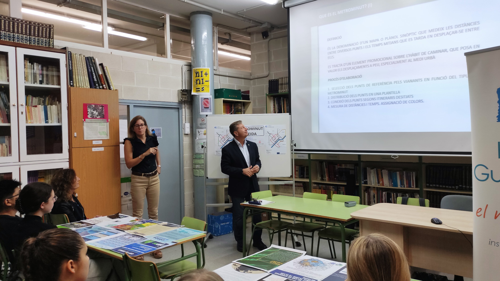 El regidor de Mobilitat i Serveis Urbans, Joan Ramon Castro, va visitar la passada setmana l'institut Guindàvols per a presentar l'esborrany del plànol Metrominut de la ciutat de Lleida als alumnes del centre, que fa temps que treballen en un projecte Erasmus+ sobre mobilitat sostenible. El Metrominut és la denominació d'un mapa o plànol sinòptic que mesura les distàncies entre diversos punts d'una ciutat i els temps mitjans que es tarda a desplaçar-se entre ells a peu. Es tracta, per tant, d'un element promocional sobre l'hàbit de caminar, que posa en valor els desplaçaments a peu, especialment al medi urbà. En una trobada anterior, els alumnes van presentar a Castro i tècnics de l'àrea de Mobilitat la seva proposta de Metrominut. El govern municipal, que ja treballava en una proposta de Metrominut fruit d'un acord amb el grup del Comú de Lleida, ha lligat aquesta iniciativa amb la proposta del centre, en el marc de l'elaboració del nou Pla de Mobilitat Urbana. El procés d'elaboració d'aquest mapa, va explicar Castro, s'inicia per la selecció dels punts de referència pels vianants, la seva distribució en una plantilla per a connectar-los segons els itineraris que es desitgin. Aleshores, es mesuren les distàncies i el temps d'aquests itineraris i s'hi assignen colors per a identificar-los més fàcilment. Els alumnes treballen sobre el Metrominut com a activitat de formació orientada a millorar el seu coneixement de l'entorn proper, fomentar els desplaçaments actius i ser conscients del temps i distància que hi ha entre els diferents indrets de referència de la ciutat. Paral·lelament, l'Ajuntament està tramitant l’expedient d'adhesió a la “Red de Ciudades que Caminan”, una associació internacional que promou la movilitat urbana a peu, amb l'objectiu de portar-la a aprovació al ple municipal de finals del mes d'octubre. Això permetrà adaptar el Metrominut de Lleida al disseny de metrominuts de la resta de ciutats. |