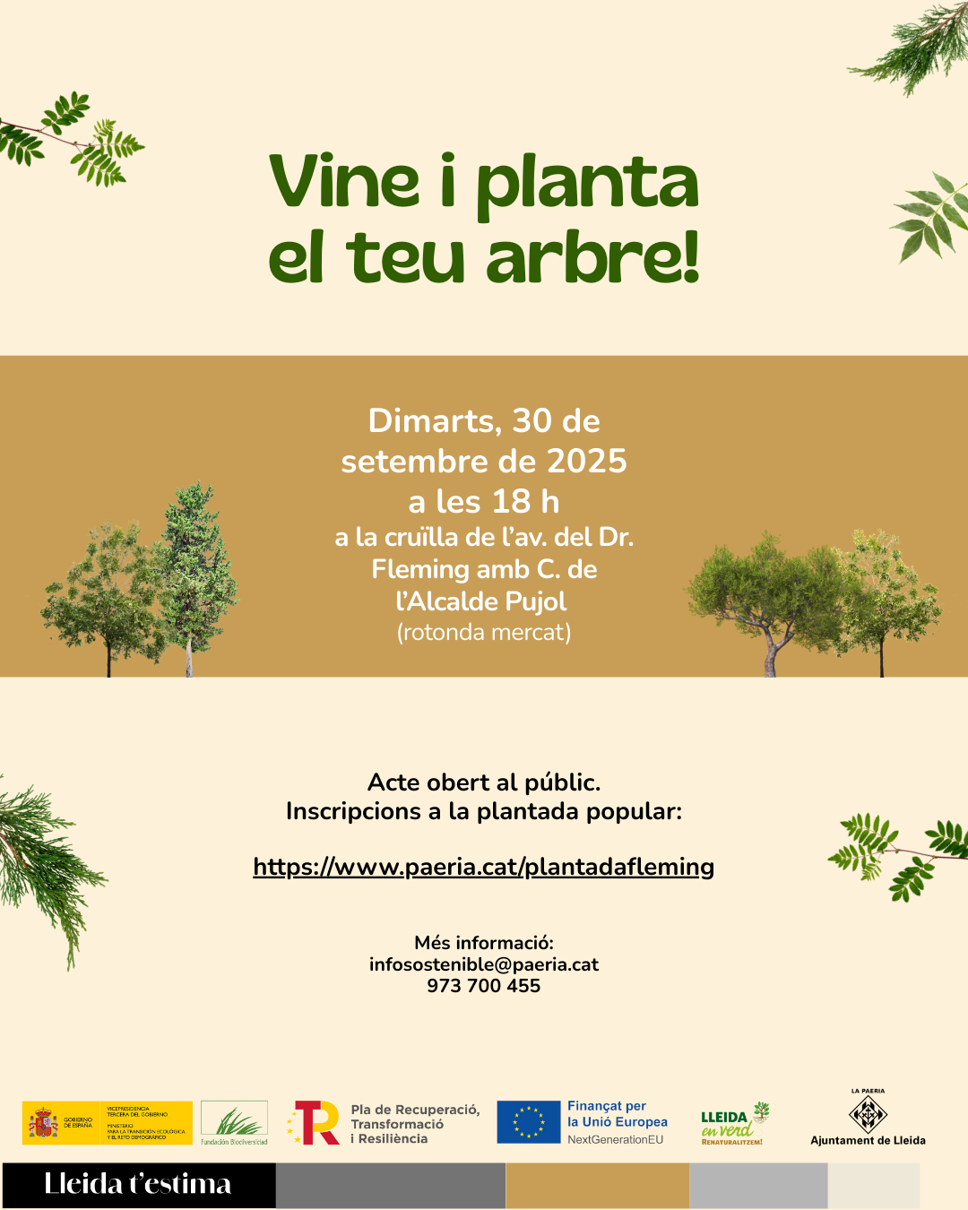 L’acte està obert al públic i s’ha habilitat un enllaç d’inscripció (https://www.paeria.cat/plantadafleming) a la plantada per tal d’acabar conformant els grups que durant a terme l’acció d’incorporar a l’espai arbres de diferents espècies adaptades al clima de Lleida. Està previst que els i les assistents puguin conèixer com s’ha dut a terme el projecte de renaturalització a Fleming de la mà del personal tècnic del projecte URBAN-NAT Lleida.