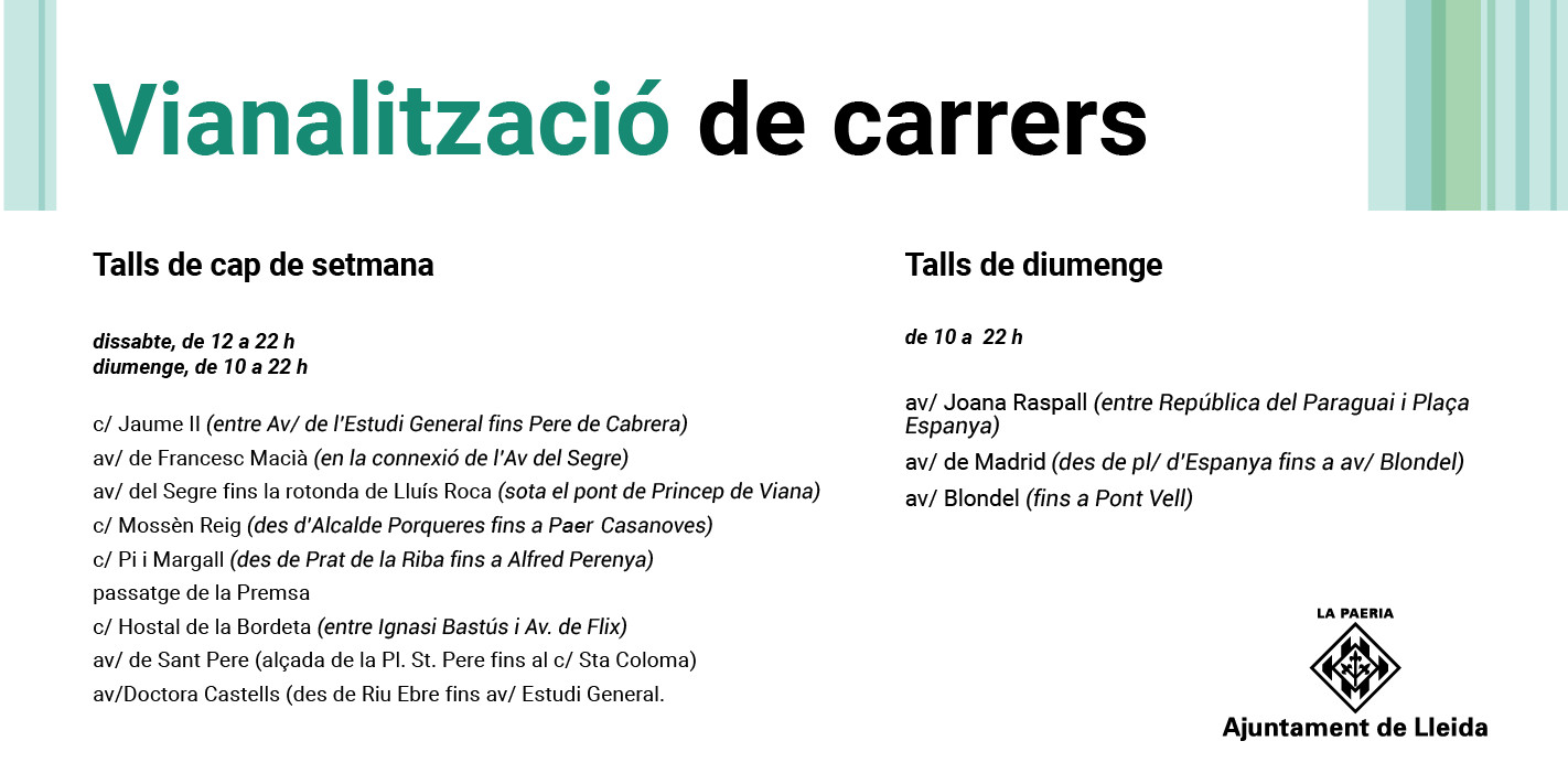 La Paeria manté aquest cap de setmana el tall al trànsit de dotze carrers i avingudes de la ciutat, amb l’objectiu de promoure que la ciutadania pugui disposar d’espais amplis de passeig, per anar amb bicicleta o patinet mantenint la distància social. Els talls es duen a terme en diferents trams i horaris, seguint la iniciativa endegada fa unes setmanes per tal de facilitar el compliment de les restriccions imposades per les autoritats sanitàries per fer front a l’epidèmia de la Covid-19 i per a conscienciar sobre una mobilitat més sostenible. Els carrers que passen a ser zona de vianants són els mateixos que el cap de setmana anterior, tenint en compte que segueix vigent la restricció al funcionament de bars i restaurants i les seves terrasses. Així, els vials afectats aquest cap de setmana del 25 i 26 de juliol són: 1) Carrers que es tallaran al trànsit dissabte de 12 a 22 h i diumenge i de 10 a 22 h: -Carrer Jaume II entre Av. de l’Estudi General fins a Pere de Cabrera. 2) Carrers que es convertiran en zona de vianants de les 10 a les 22 h del diumenge: -Avinguda de Joana Raspall entre República del Paraguai i la plaça d’Espanya. |