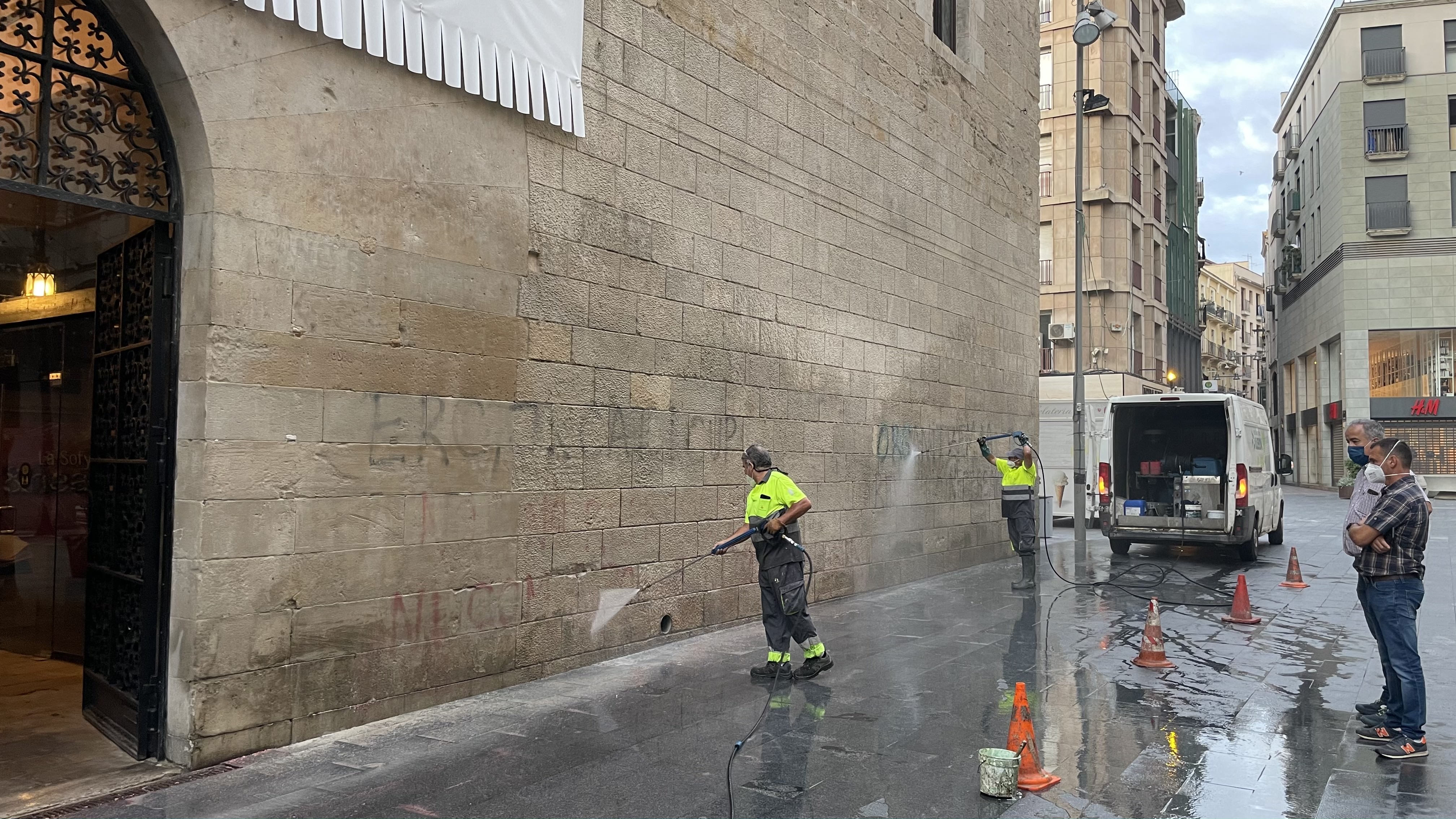 Operaris de l’empresa concessionària del servei de neteja de la ciutat, Ilnet, han dut a terme avui a primera hora del matí una actuació de neteja de les pintades que van aparèixer el passat dissabte a la façana gòtica de l'antic Hospital de Santa Maria, seu de l’Institut d’Estudis Ilerdencs (IEI) i edifici catalogat com a Bé Cultural d'Interès Nacional.