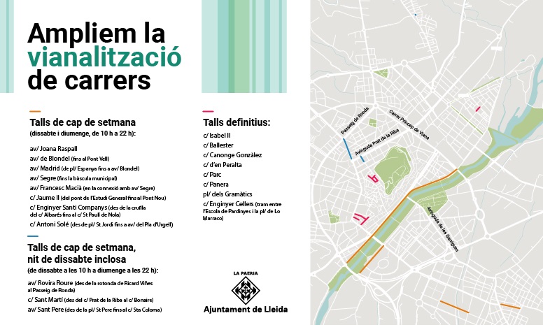 L’Ajuntament de Lleida segueix avançant en la definició del mapa de la ciutat que inclou la conversió de carrers en zones de vianants, amb talls provisionals o definitius, per pacificar el trànsit viari i afavorir els desplaçaments a peu. La Regidoria de Mobilitat, Vialitat, Trànsit i Horta ha iniciat aquest mes de maig la vianalització de diverses vies, que s’han anat ampliant els caps de setmana, a mesura que es va implantant l’actuació. Així, al plantejament actual s’afegeix un nou carrer de la Bordeta, el C/ Antoni Solé, des de la plaça de Sant Jordi fins a l’avinguda del Pla d’Urgell. La conversió de carrers en espais per a vianants s’ha fet aprofitant la situació d’emergència per la Covid-19, en què, d’acord a l’estat d’alarma, s’ha hagut de reduir i regular la circulació, tant de vehicles com de persones. L’objectiu és aconseguir una major conciliació del trànsit i reduir les emissions contaminants. Es contemplen tres tipus de talls: - El carrer Enginyer Santi Companys, entre els carrers Aubarés i Sant Paulí de Nola, en tots dos sentits - L’avinguda Joana Raspall, en tots dos sentits - L’avinguda de Madrid, des de la plaça d’Espanya fins a l’avinguda de Blondel (només la calçada més pròxima al riu) - L’avinguda de Blondel fins al Pont Vell (només la calçada més pròxima al riu) - L’avinguda de Francesc Macià en la connexió de l’Av del Segre (només la calçada més pròxima al riu) - L’avinguda del Segre fins a la rotonda de Lluís Roca, sota el pont de Príncep de Viana (només la calçada més pròxima al riu) -L’avinguda de Sant Pere, de la plaça de Sant Pere fins al carrer Santa Coloma |
