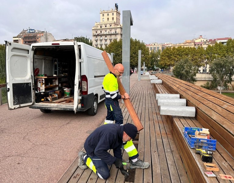 Operaris de la brigada d’obres de l’Ajuntament de Lleida han reparat aquest matí desperfectes a les travesses de fusta del paviment de la passarel·la del Liceu Escolar, que havien estat arrencades per un acte vandàlic, fet que podia comportar risc de caigudes.