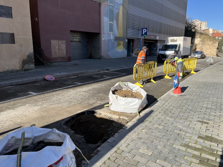 Els serveis tècnics municipals i la Brigada d’Acció Immediata treballen des de primera hora d’avui en la reparació d’un esvoranc aparegut a la calçada a l’altura del número 23 del carrer La Parra.
