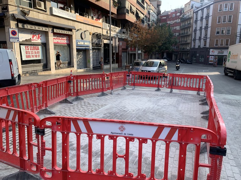 La brigada d’obres treballa en la substitució dels llambordins malmesos en el pas de vianants a l’encreuament amb el carrer Pi i Margall.