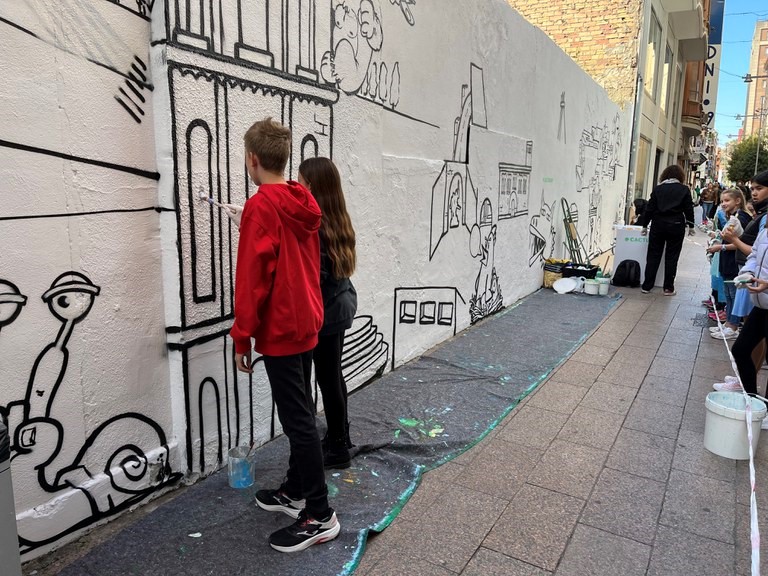 Alumnes de les escoles Maristes, Santa Anna i Sant Jaume han participat en la pintura del mural, que ha estat dissenyat per l’empresa Cactusoup, i que s’ha refet a petició de l’associació de comerciants