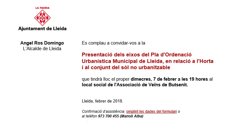 Presentació dels eixos del Pla d'Ordenació Urbanística Municipal de Lleida, en relació a l'Horta i al conjunt del sòl no urbanitzable