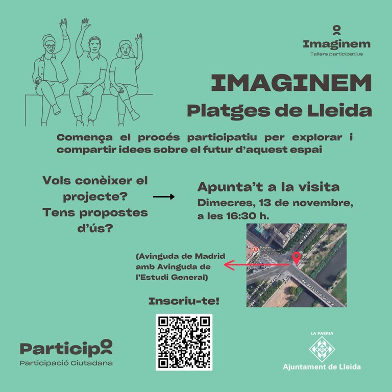 La primera acció de l’Imaginem Platges de Lleida és la visita d’una part de la zona del riu per descobrir i pensar col·lectivament com transformar l’espai en un lloc per a tothom. El procés avançarà amb una metodologia que inclourà grups focals i taules d’experts, sessions participatius i deliberatives per fomentar la interacció entre col·lectius diversos, etc. Amb accions presencials i eines digitals, es vol garantir la màxima implicació dels veïns i les veïnes, perquè el resultat final sigui realment un projecte comunitari i de ciutat.
