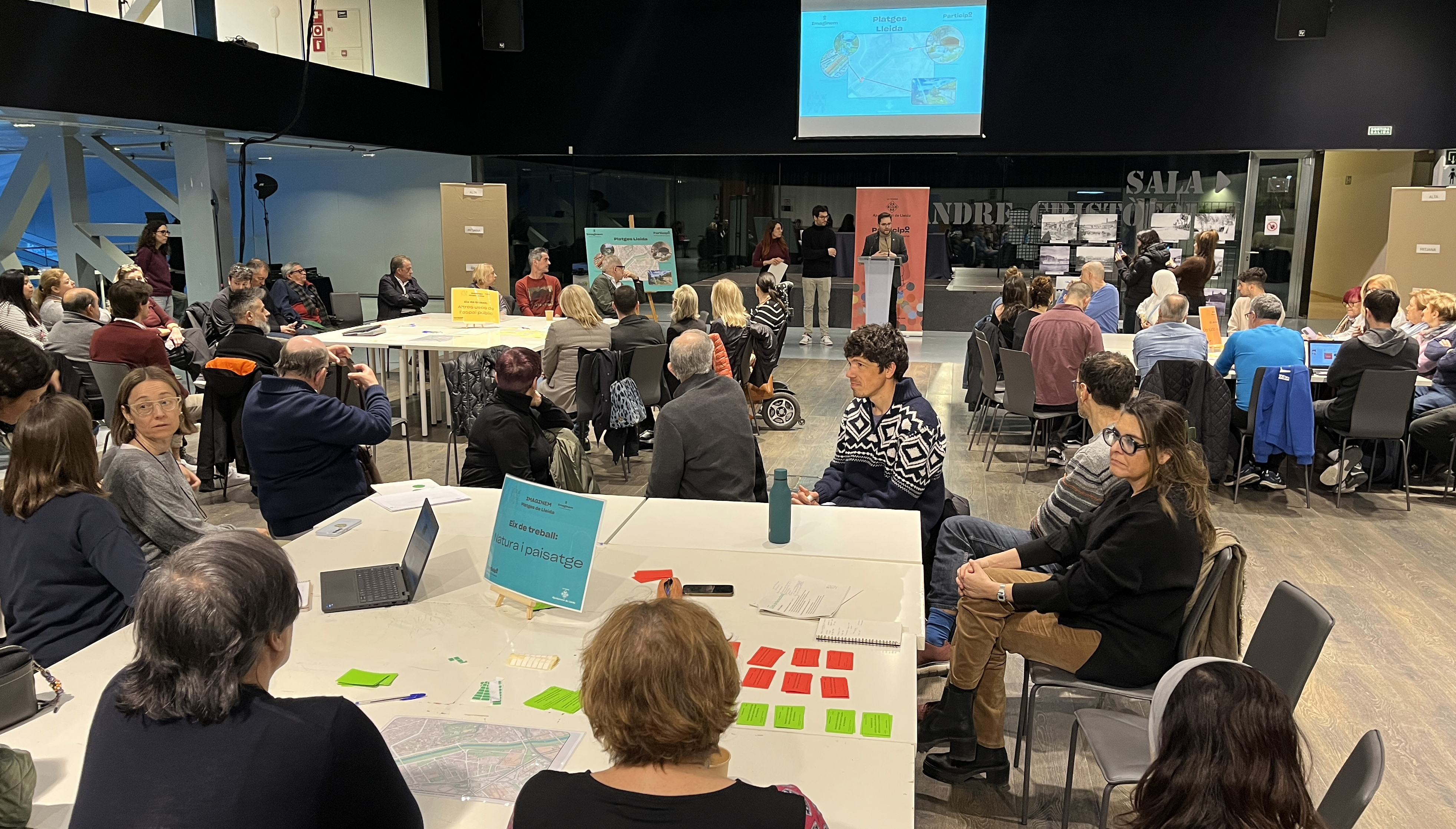 Una setantena de persones han participat en el taller d’aquesta tarda a la Llotja dins l’Imaginem Platges de Lleida per avançar en els possibles usos de la llera del riu Segre. El paer en cap, Fèlix Larrosa, acompanyat del regidor de Participació, Roberto Pino, ha assistit a la sessió i ha interactuat en una de les taules de treball, en què s’han proposat i s'han prioritzat algunes idees. Pino ha explicat la dinàmica del taller i ha animat tothom a prendre part dels processos participatius per plantejar i debatre conjuntament els usos i activitats per a les Platges de Lleida. Ha comentat que a Lleida es vol impulsar un projecte de platja fluvial des de la ciutadania i per a la ciutadania. L’actuació contempla el tram comprès entre la zona de les comportes i la zona del Camp Escolar.