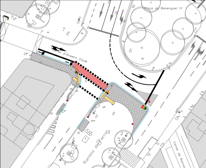 Ha elaborat un projecte en què es renoven els semàfors existents en aquest punt, amb pas per a ciclistes i instal·lació de comptadors per a vianants; es desplaça el pas de vianants; s’amplia el tram final de vorera d’A.Clavé i es perllonga el carril bici des de Cardenal Remolins fins la rambla.