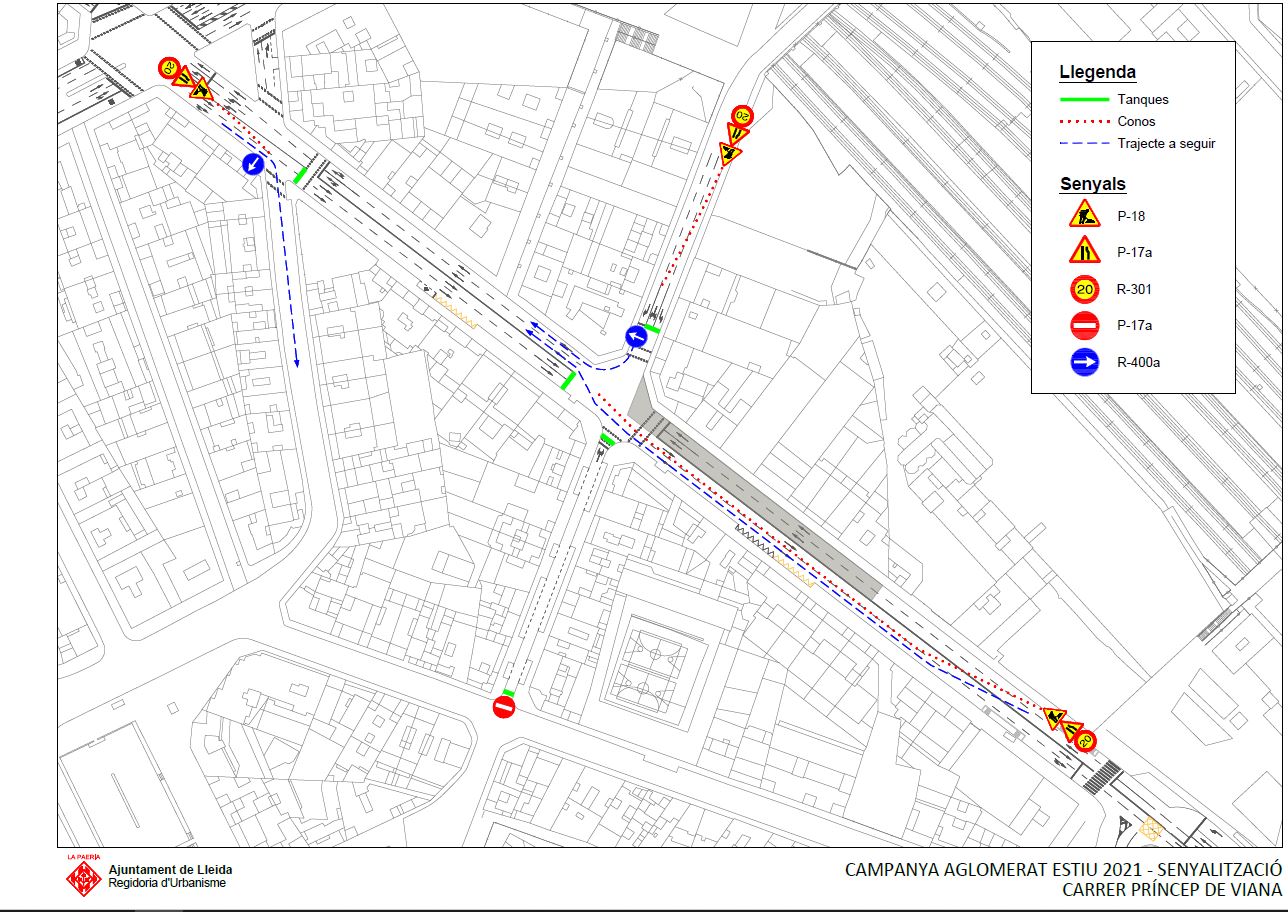 L’Ajuntament de Lleida inicia aquest dijous a la nit els treballs de renovació del paviment asfàltic en un tram de la calçada del carrer Príncep de Viana i la reparació dels desperfectes del paviment existents a l’Avinguda de Catalunya, provocats per la crema de contenidors de fa uns mesos. Els treballs de pavimentació tindran lloc la nit de dijous a divendres i, la pintura, es realitzarà fins a principis de la setmana vinent. L’execució dels treballs comportarà diversos talls i desviaments del transit d’aquests carrers. Actuació de millora del paviment a Príncep de Viana L’actuació compren una zona dels dos carrils de circulació sentit Prat de la Riba, entre la plaça Ramon Berenguer IV i el carrer Comtes d’Urgell (croquis adjunt). Aquesta actuació es durà a terme la nit de dijous 12 d’agost (des de les 20 hores) a divendres 13 d’agost (fins les 8 hores) Els desviament de trànsit previst per poder realitzar els treballs és el següent: • Els vehicles que circulen per Princep Viana sentit Plaça Ramon Berenguer IV (tram carrer Sant Ruf- Plaça Ramon Berenguer IV ) es desviaran per carrer Sant Ruf- carrer Anselm Claver Actuació de millora a l’Avinguda Catalunya L’actuació compren una zona dels dos carrils de circulació sentit Plaça Ricard Vinyes, entre el carrer Bisbe Torres i el carrer Lluis Companys (croquis adjunt). Aquesta actuació es durà a terme la nit de dijous 12 d’agost (des de les 20 hores) a divendres 13 d’agost (fins a les 8 hores) Per realitzar aquesta actuació es preveu: • Tots els vehicles que circulen per Avda Catalunya sentit Plaça Espanya hauran de circular per un únic carril. Les millores s’emmarquen dins el Pla de Manteniment, Conservació i Millora de Paviments d’Aglomerat Asfàltic de la Paeria i els porta a terme l’empresa Sorigué. Cal destacar que les actuacions de millora del paviment es realitzen durant l’estiu i en horari nocturn per minimitzar les molèsties a la ciutadania.
