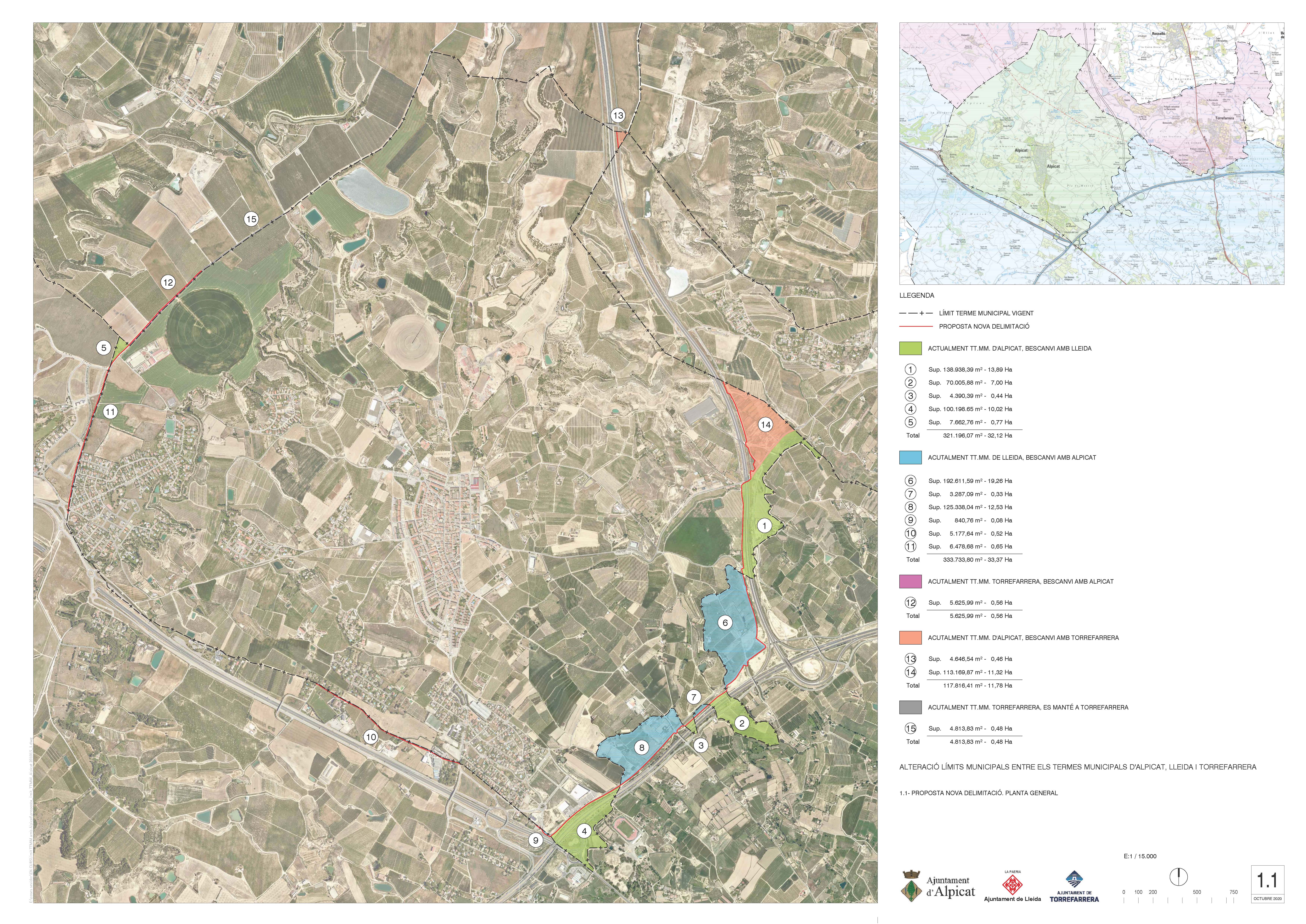 La comissió d’ Urbanisme ha informat favorablement avui de l’acord a què ha arribat amb els Ajuntaments d’Alpicat i Torrefarrera per modificar els límits del terme municipal. Es tracta d’una operació adreçada a facilitar els tràmits urbanístics i poder emprendre accions com la millora dels accessos a terrenys com Les Basses. Amb l’acord signat amb els tres ajuntaments s’inicia formalment la tramitació de l’alteració dels límits municipals entre les diferents localitats amb la voluntat de tirar-ho endavant amb celeritat. El primer tinent d’alcalde i regidor d’Urbanisme, Toni Postius, ha explicat que amb la construcció de la variant nord i l’autovia va esdevenir una ‘frontera urbanística’ entre Lleida i Alpicat amb terrenys que van quedar dividits per aquesta via i en fa més complicat la gestió urbanística: “Hi ha terrenys de Lleida que es troben en la zona propera a Alpicat i a l’inrevés. Ara el que fem és endreçar-ho i és una operació important perquè el sector de les Basses, tot el tram des que acaba les Basses, fins a l’autovia és d’Alpicat”. Postius ha explicat que es van iniciar converses amb l’ajuntament d’Alpicat per intentar esmenar la situació d’aquest punt i també des del punt de vista de solars que hi ha a l'altra banda de l'autovia i, en paral·lel, també es va contactar amb l’Ajuntament de Torrefarera. L’operació suposarà que 32,12 ha actualment del terme municipal d’Alpicat seran del terme municipal de Lleida, 33,37 ha del terme municipal de Lleida passaran al terme municipal d’Alpicat, es bescanviaran, a la vegada 0.56 ha que són del terme municipal de Torrefarrera passaran al terme d’ Alpicat i 11,79ha d’Alpicat seran de Torrefarrera (veure plànol adjunt) En marxa el nou polígon industrial del SUR-35 La comissió d’Urbanisme ha donat llum verda avui al nou polígon industrial de 36ha situat entre l’LL-11 i el polígon industrial del Camí dels Frares, SUR-35, un cop finalitzades les tramitacions urbanístiques corresponents. La previsió és que les obres d’urbanització puguin començar abans de finalitzar aquest mateix any. Toni Postius ha destacat que es tracta d’una “bona notícia que ens permet donar la benvinguda a un polígon d’iniciativa privada, que ja té bastant avançada la seva comercialització i permetrà acollir noves empreses” i que permet comptar amb nou sòl d’ús industrial una mancança històrica de la ciutat. Postius ha explicat que es preveu que els treballs d’urbanització puguin començar abans de finals d’any: “Urbanísticament està resolt tot l’expedient, poden començar les obres d’urbanització i, a partir d’aquí es podran començar a tramitar les llicències d’obres de les naus industrials que es considerin, tant pel que fa referència a l’apartat de subzona de gran indústria com al que fa referència a activitats logístiques d’indústria mitjana”. Nous habitatges al Centre Històric En la reunió ordinària de la comissió informativa de polítiques de Gestió Urbanística i Mobilitat s’ha informat favorablement també de l’aprovació provisional de la Ua 100, que delimita un àmbit d’actuació al Centre Històric de prop de 2.000 m2. Aquesta actuació té per objectiu agrupar finques en un sol àmbit d’actuació que permeti desenvolupar projectes unitaris amb dimensions suficients per desenvolupar tant habitatges com locals per a activitats econòmiques i aparcaments. El sostre total de l’àmbit és de 3.338, 65 m2 i s’hi podran construir 33 habitatges, aproximadament.
