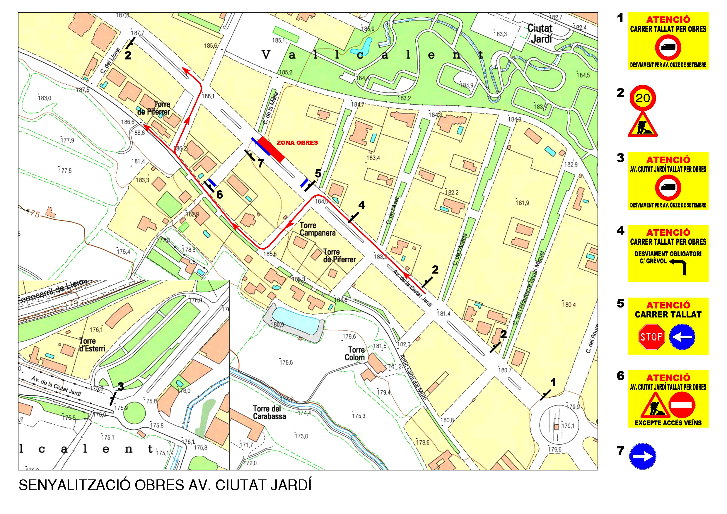 Per executar les obres, serà necessari tallar l’avinguda Ciutat Jardí, en el sentit de sortida a la ciutat, entre els carrers Grèvol i Baldomer Gil i Roig. Els vehicles que accedeixen per l’avinguda es desviaran cap al carrer Grèvol i Camí del Murri i retornaran a l’avinguda Ciutat Jardí pel carrer Baldomer Gil i Roig. Mentre durin les obres de reparació, es prohibirà l’accés de camions a l’avinguda Ciutat Jardí en sentit sortida Lleida (la ruta alternativa serà per l’avinguda Onze de Setembre) i es recomana que només circulin per Ciutat Jardí els veïns. Aquestes restriccions duraran una setmana aproximadament. Les obres s’iniciaran el pròxim dilluns, dia 29 de març. La reparació està prevista realitzar en tres o quatre dies, però caldrà tenir el trànsit tallat altres tres dies més perquè no es podrà passar per damunt de la zona arranjada. En definitiva, està previst que el trànsit es pugui restablir amb normalitat a partir del 6 d’abril. Les obres es realitzaran durant aquests dies de vacances de la Setmana Santa per reduir les molèsties que ocasionen les restriccions de trànsit. Aquesta reparació està inclosa dins el contracte del Pla de Manteniment, Conservació i Millora de Voreres i Brigada d’Acció Immediata, adjudicat a B.Biosca.