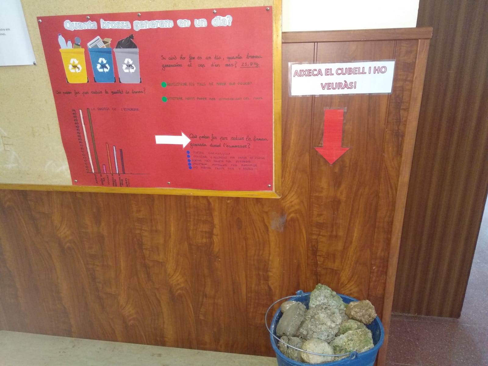 Un cop fet el debat s’ha preparat un mural recollint el resum de les aportacions del debat de les classes. A continuació s’ha calculat quanta brossa generaríem, en el dia a dia de les aules, al llarg d’un més. S’ha omplert una galleda amb pedres amb el mateix pes obtingut. D’aquesta manera els alumnes, aixecant la galleda, poden fer-se a la idea del que suposa el pes obtingut.