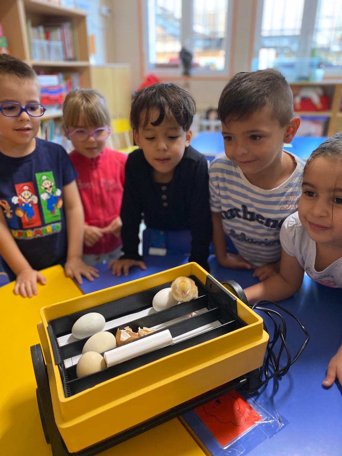 No tots els ous es van fecundar bé, vam poder detectar que alguns havien tingut problemes, el procés d’incubació no era l’esperat. Però no tot va ser negatiu, en el procés d’aprenentatge, també vam poder descobrir, que quan arribar el dia vint-i-un d’incubació, dos ous s’estaven trencant, sentíem piular i semblava que hi havia dos pollets que volien sortir. Va ser tot un esdeveniment, tots estàvem exultants d’alegria. Van néixer sans, una mica petits, però molt bonics. Tota l’escola els va venir a conèixer.