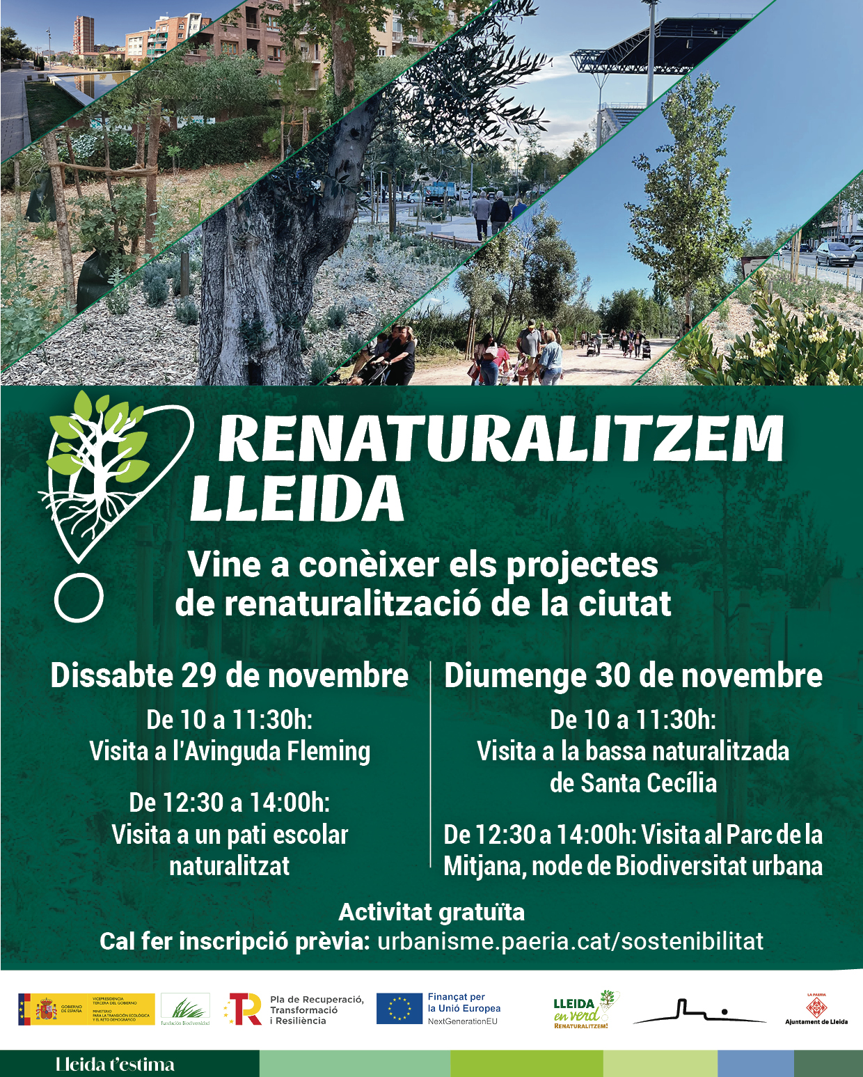 L'Ajuntament de Lleida està portant a terme un projecte de renaturalització de la ciutat, dintre del Pla de Recuperació, Transformació i Resiliència de la Unió Europea. Aquest projecte forma part de la iniciativa URBAN-NATLleida, finançada amb fons NextGenerationEU, i té com a objectiu ampliar els espais verds urbans per mitigar els efectes del canvi climàtic i promoure la biodiversitat, fent la ciutat més sostenible i preparada per afrontar els reptes de futur. Durant aquest cap de setmana podrem visitar alguns dels espais renaturalitzats i adonar-nos dels seus efectes positius.