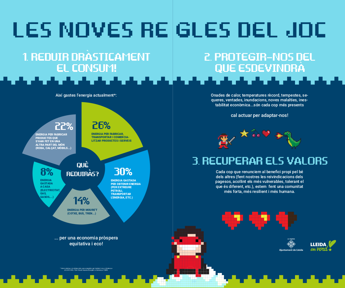L’Ajuntament de Lleida estarà present a Fira Natura aquest cap de setmana amb un estand que conscienciarà sobre l’emergència climàtica. La Regidoria de Transició Ecològica ha preparat l’exposició “Estem jugant amb el planeta”, que recull propostes d’acció amb una estètica de videojoc. Els plafons conviden la ciutadana a interactuar amb un test per mesurar la “temperatura” del seu grau de compromís respecte a la crisi climàtica, per copsar si estarien disposades a renunciar al cotxe, viatjar amb avió o reduir el consum de carn, entre altres. La iniciativa és una prova pilot, que té la voluntat d’utilitzar-se com a recurs educatiu en els instituts de la ciutat a través del programa Agenda 21, pla per actuar en favor del desenvolupament sostenible. L'exposició de l'estand de la Paeria descriu, a través d'un format molt visual, com s’està gastant l'energia i es donen eines per portar a terme la transició energètica i ecològica. Els visitants també podran saber quin és el futur que s'ha de preveure a Lleida pel que fa a temperatures, pluja i boira. L'estand també difondrà la tasca que es fa des del Centre d'acollida d'Animals de Companyia (CAAC Lleida) per fomentar l'adopció de gossos i gats. Fira Natura obre portes demà i ha organitzat activitats i xerrades fins diumenge, amb professionals convidats i a través dels estands que hi col·laboren. És una fira de medi ambient, amb propostes per sensibilitzar i promoure hàbits més sensibles, respectuosos i saludables per al medi i les persones. |