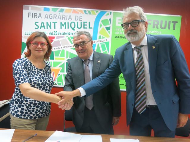 L’alcalde Àngel Ros ha presidit la signatura del conveni amb el Col·legi de Veterinaris de Lleida i el Consell de Veterinaris de Catalunya en matèria de gestió del cens municipal d’animals. A l’acte, que s’ha celebrat en el marc de la Fira de Sant Miquel, han assistit la presidenta del Col·legi de Veterinaris de Lleida, Carmen López, i el tinent d’alcalde iregidor de l’Hàbitat Urbà i Rural i la Sostenibilitat, Fèlix Larrosa.