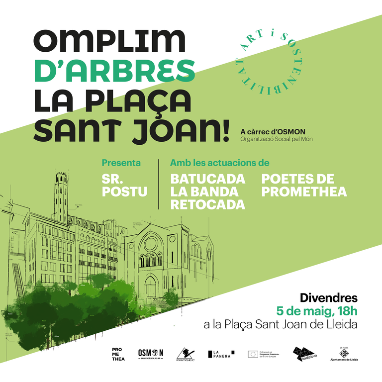 Aquest divendres, 5 de maig, de 18 a 20 hores, la plaça Sant Joan acollirà l’acció “Volem una ciutat verda” a càrrec d’OSMON, que servirà per cloure el projecte AS Art i Sostenibilitat que ha impulsat l’Ajuntament de Lleida i dins del qual s’han dut a terme diferents accions artístiques entre els mesos de març i maig per a la lluita contra el canvi climàtic a la ciutat.