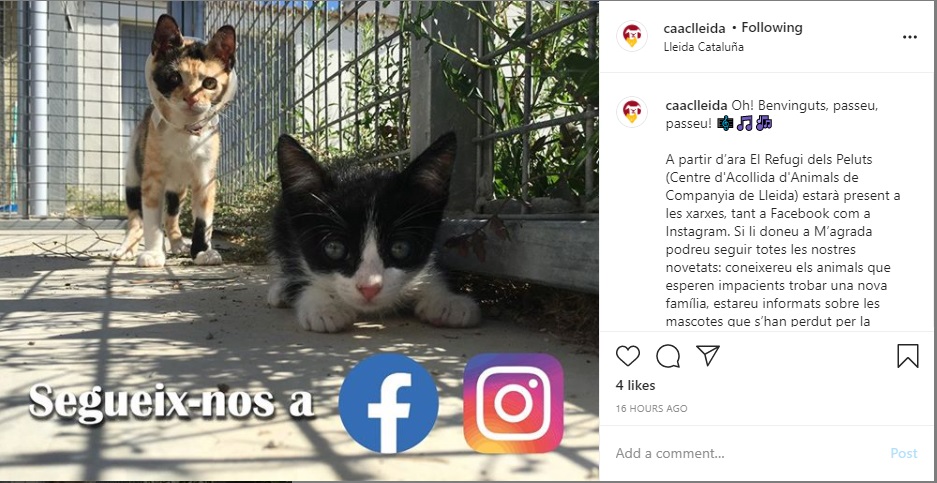 El Refugi dels Peluts, conegut també com el Centre d’Acollida d’Animals de Companyia (CAAC) de Lleida, acaba d’estrenar xarxes socials pròpies i ja té presència a Facebook i Instagram amb el nom d’usuari @caaclleida. Es tracta d’un pas més en la campanya promoguda pel govern de la Paeria per a revitalitzar els serveis que ofereix el centre i millorar la qualitat de vida dels animals que actualment hi romanen. L’objectiu d’aquest salt digital és informar a la ciutadania de Lleida sobre les novetats del refugi i, alhora, guanyar en transparència i proximitat. Així, tothom que vulgui podrà conèixer setmana a setmana alguns dels animals en adopció, trobar informació sobre les mascotes rescatades en via pública i descobrir quin és el funcionament diari d’un centre d’acollida, entre d’altres informacions d’interès. Cal recordar que “El Refugi dels Peluts” ha incorporat aquest any una veterinària a mitjà jornada i un dinamitzador. A banda d’aquestes dues figures, el centre compta també amb una brigada formada per sis cuidadors i un equip de voluntaris que recentment s’ha vist ampliat a 13 persones. Tots ells tenen cura d’una vuitantena de gossos i d'una trentena de gats. |