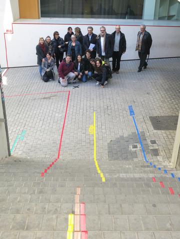 L’actuació ha consistit en la col·locació d’una imatge al terra i les parets que envolten l’edifici del centre, una imatge que té sentit quan s’observa des de l’accés de l’escola i que afecta dos àmbits especials diferents, un proper i l’altre llunyà.