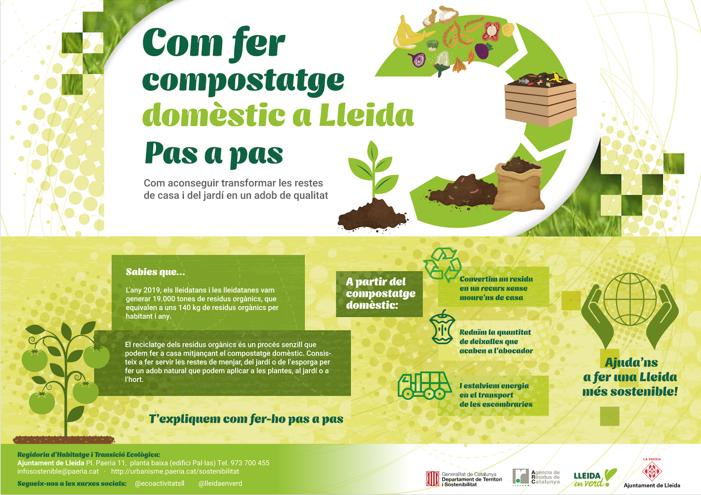 La Regidoria d’Habitatge i Transició Ecològica de l’Ajuntament de Lleida impulsa la campanya “Com fer compostatge domèstic a Lleida. Pas a Pas”, amb l’objectiu de promoure el reciclatge dels residus orgànics. El tinent d’alcalde Sergi Talamonte ha destacat que el 2019 es van generar a Lleida 19.000 tones de residus orgànics, que equivalen a uns 140 Kg per habitant i any: “A partir del compostatge domèstic es pot transformar un residu en un recurs i ho podem fer sense moure’ns de casa. Contribuïm així a reduir la qualitat de deixalles que acaben a l’abocador i s’estalvia energia en el transport de les escombraries”. Les persones que participin en la campanya tindran la possibilitat de rebre un compostador (300 litres) i un airejador en cessió d’ús, assessorament tècnic per a una bona pràctica de compostatge i formació tècnica d'iniciació i d’aprofundiment. L’acció es coordina des de l’Ajuntament de Lleida amb la col·laboració de l’Agència de Residus de Catalunya. Les interessades i interessats poden tramitar la sol·licitud a través del web paeria.cat, en l'apartat de tràmits on line. Els compostadors s’atorgaran per ordre d’arribada i es donarà prioritat als residents de l'Horta de Lleida fins el 31 d’octubre de 2020. El 5 de novembre tindrà lloc el Curs d'iniciació al compostatge adreçat a les persones inscrites a la campanya. El tràmit d’inscripció s’obrirà en els pròxims dies. Per a més informació, es pot contactar amb infosostenible@paeria.es o al telèfon 973 700 455. |