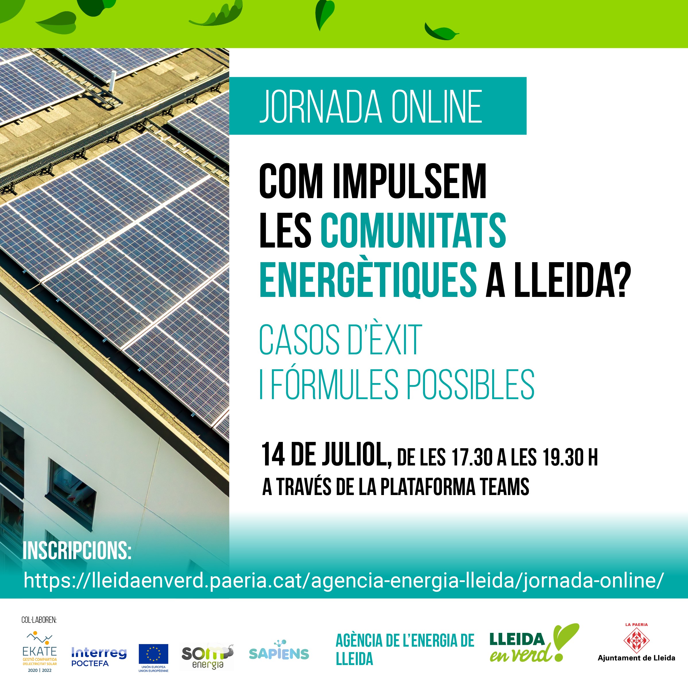 L’Ajuntament de Lleida ha organitzat pel pròxim dimecres, 14 de juliol, una jornada informativa per a impulsar les comunitats energètiques a Lleida, mitjançant l’exposició dels casos d’èxit i les seves fórmules possibles. Els interessats en participar en aquesta activitat, que es desenvoluparà a través de la plataforma Teams, poden fer la inscripció clicant en aquest enllaç. El tinent d’alcalde i regidor de Transició Ecològica, Sergi Talamonte, que serà l’encarregat de presentar la jornada i donar pas als diferents ponents, ha assenyalat que “els ajuntaments poden jugar un paper clau en la promoció, creació i dinamització d’aquestes comunitats per la seva posició local i més propera a la ciutadania”. |