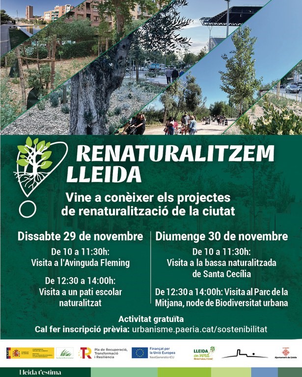 L’Ajuntament de Lleida ha programat de nou un cap de setmana dedicat a conèixer els projectes URBAN-NAT Lleida de renaturalització, adaptació al canvi climàtic i millora de la biodiversitat de Lleida. El dissabte 29 i el diumenge 30 de novembre, el personal tècnic encarregat del projecte de la regidoria de sostenibilitat, mostrarà les diferents actuacions que s’estan duent a terme des de finals de 2022 i que finalitzen, pel que fa a l’obra pública, a finals d'any.