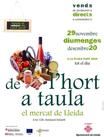 El propers dies 29 de novembre i 20 de desembre, a la plaça Sant Joan, l'Ajuntament de Lleida organitza una mercat on els ciutadans podran adquirir productes alimentaris directament de la mà dels seus productors