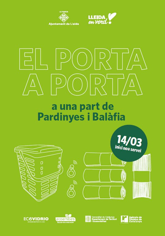 Lleida inicia, aquest diumenge, la recollida selectiva de residus porta a porta a una part dels barris de Pardinyes i Balàfia, un model de recollida que consisteix a lliurar els residus separats davant del portal de casa seguint un calendari preestablert per a cada fracció.