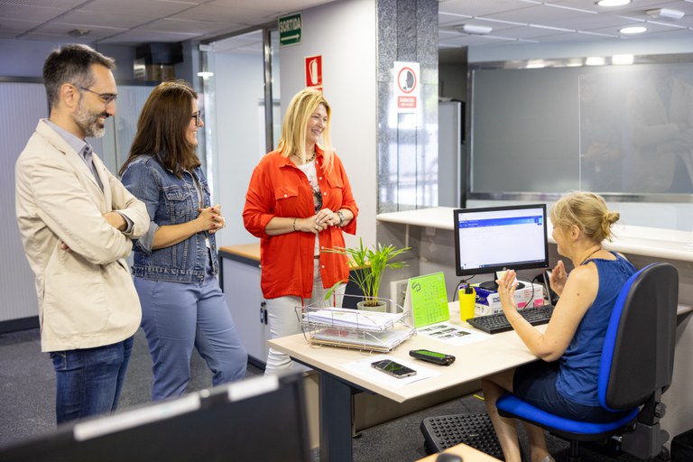 Les tinentes d'alcalde Begoña Iglesias i Cristina Morón han visitat aquest matí el personal de l'EMAU (Empresa Municipal d'Agenda Urbana de Lleida) del Dipòsit Municipal de Vehicles i de l'oficina de la plaça Blas Infante. A la trobada hi ha assistit també el gerent de l'EMAU, Samuel de la Fuente.